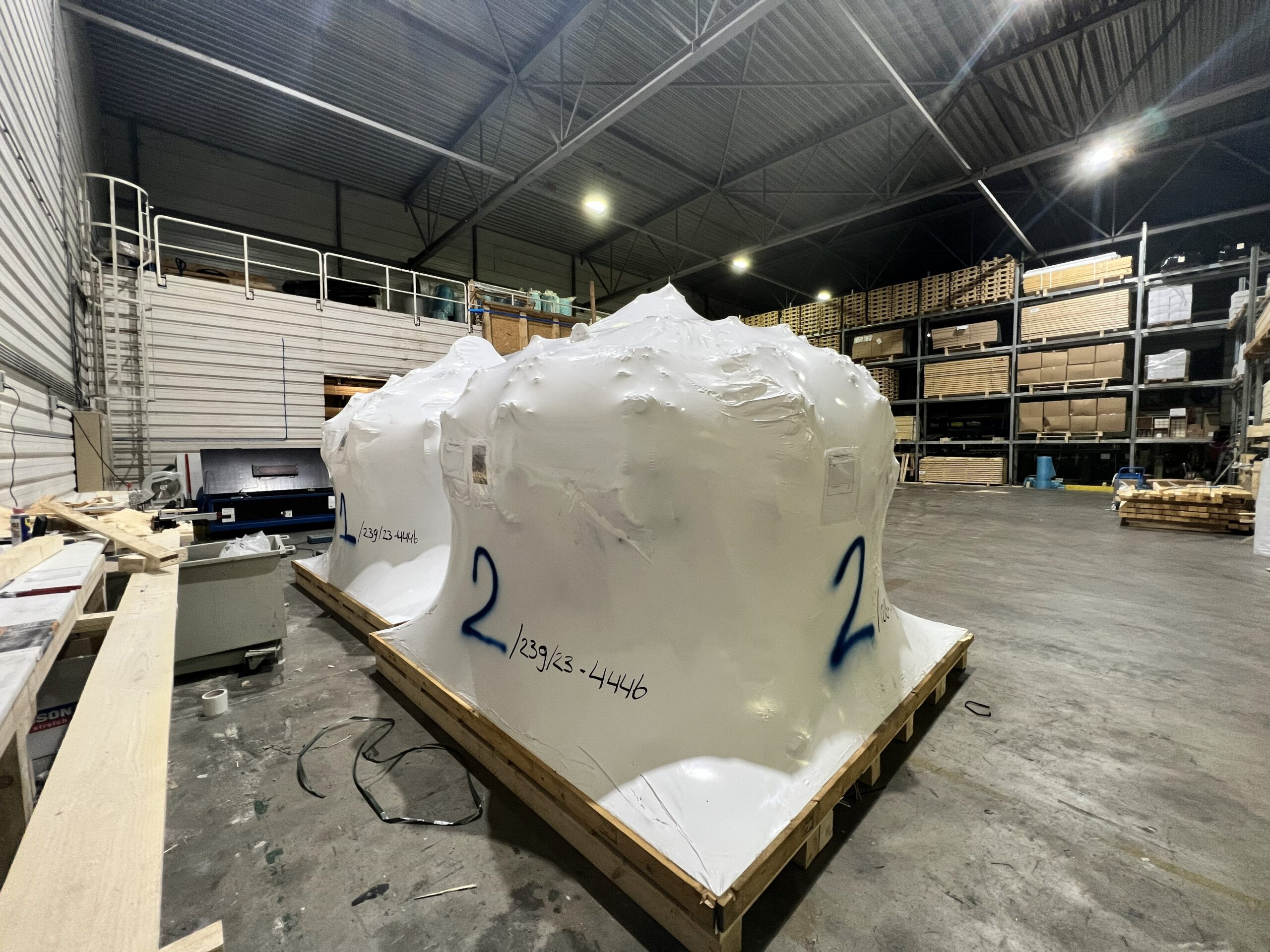 Durable shrink wrapping for stabilisation and surface protection during transport or temporary outdoor storage.